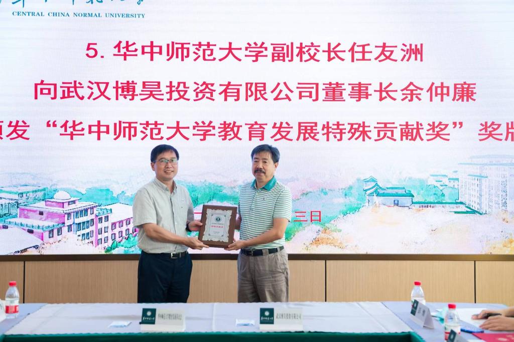 任友洲向余仲廉頒發“華中師范大學教育發展特殊貢獻獎”獎牌