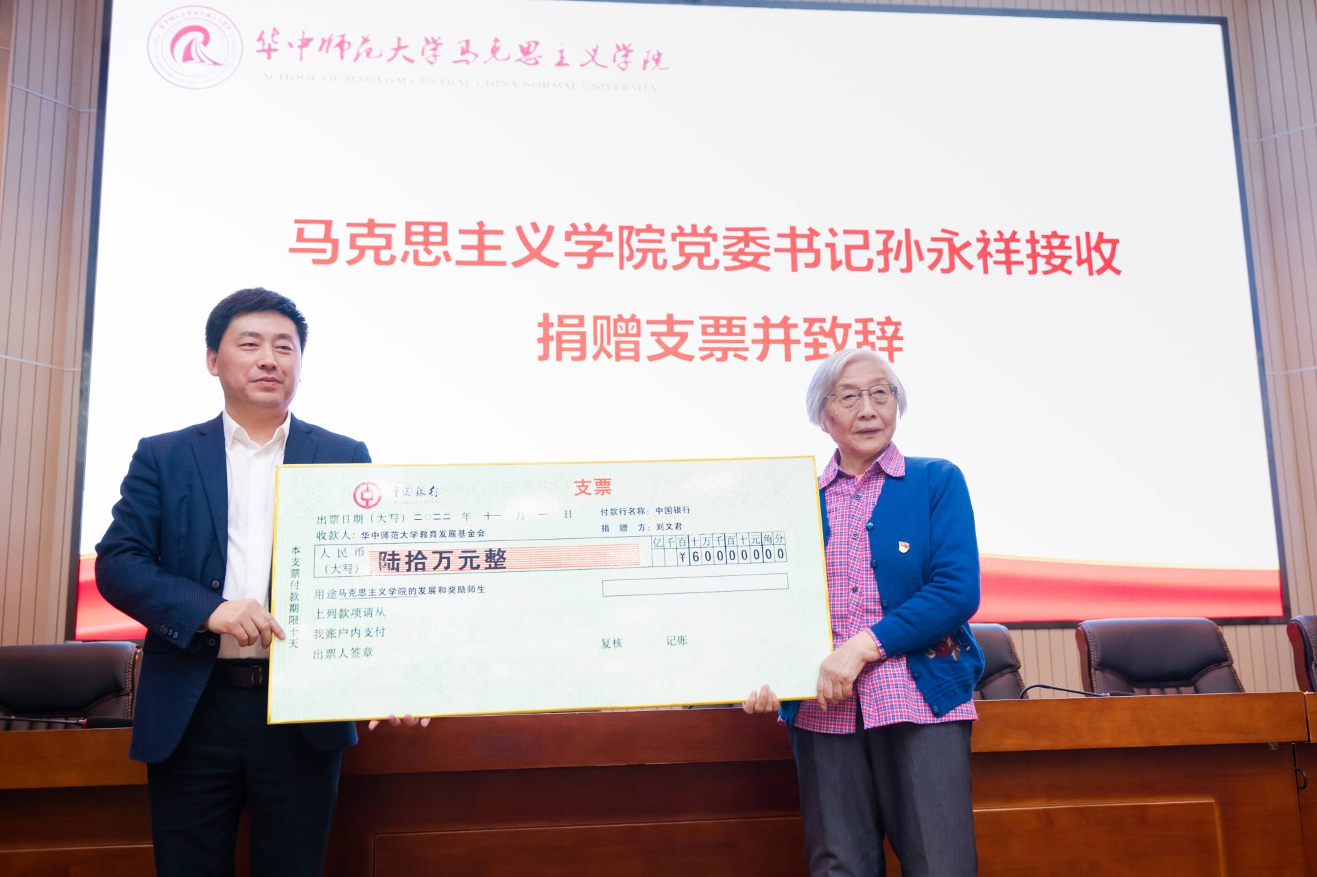 “我今年86歲,過去的86年,前18年是在河南,剩下的68年是在武漢、在華師,更確切地說,是在馬院。”捐贈(zèng)儀式上,“青君教育人才發(fā)展基金”捐贈(zèng)人、馬克思主義學(xué)院退休教師、中共黨員劉文君教授深情回顧了往昔時(shí)光,回顧了她在華師、在馬院的溫情歲月。觀看了黨的二十大開幕會(huì)后,劉文君就明確表達(dá)要為黨、為華師、為馬院再盡自己一份力。“我是在馬克思主義學(xué)院鍛煉成長的,在感謝的同時(shí),也希望這個(gè)宣傳馬克思主義的陣地更加繁榮昌盛。”老人動(dòng)情地說。