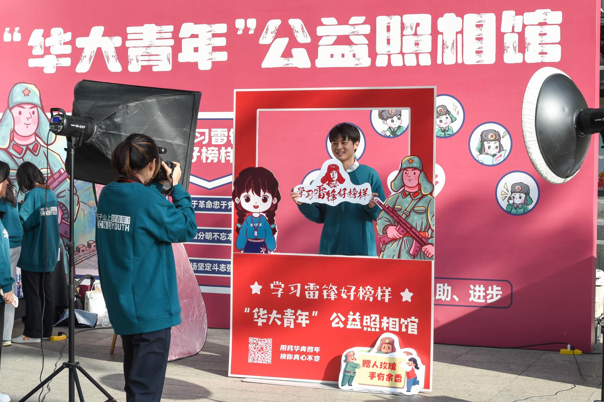 “華大青年傳媒中心”曾于2022年7月前往“壩頭庫首第一村”開設“公益照相館”,為鄉親們免費拍攝生活照,被《人民日報》報道。在“第60個學雷鋒紀念日”之際,“華大青年”公益照相館賡續雷鋒精神,繼續為師生辦實事。在活動現場,他們自行設計、搭建“學雷鋒”主題展板、合影墻,免費為廣大師生、青年志愿者拍攝1000余張照片,用鏡頭定格美好,將奉獻故事傳唱。