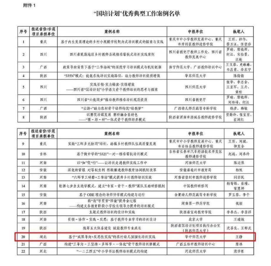 華大在線訊(通訊員 滕朝陽)11月22日,“國培計劃”中小學骨干教師培訓項目執行辦公室公布2022年“國培計劃”優秀典型案例評選結果,來自全國各地各校的40個優秀典型工作案例和40個優秀教師成長案例入選。由我校培訓中心(職業與繼續教育學院)報送的工作案例《基于“成果導向+反思性實踐” 的農村幼兒園園長培訓實踐》是湖北省唯一入選案例。
