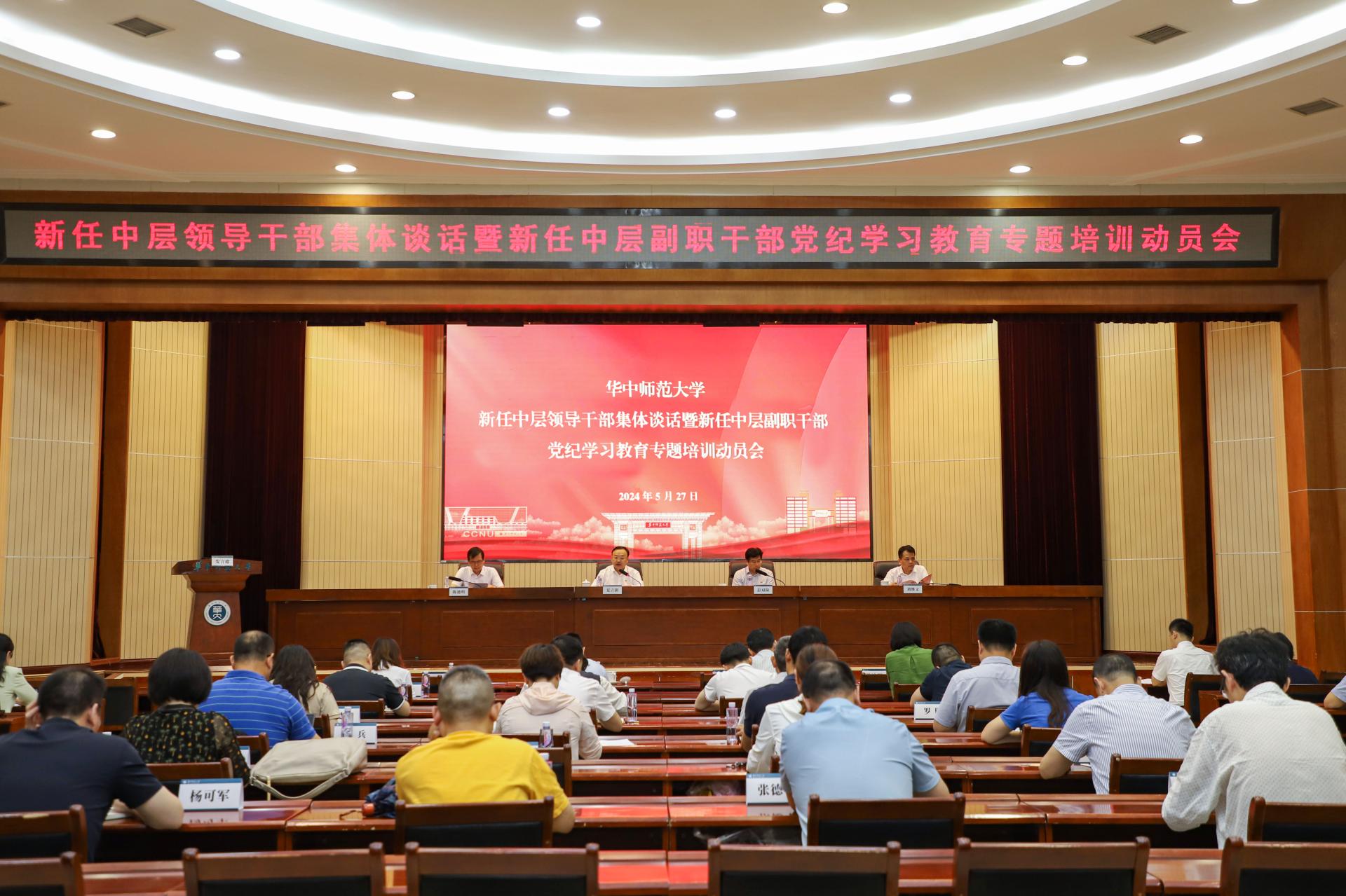 華大在線訊(通訊員 張栩晨)5月27日,學(xué)校新任中層領(lǐng)導(dǎo)干部集體談話暨新任中層副職干部黨紀(jì)學(xué)習(xí)教育專(zhuān)題培訓(xùn)動(dòng)員會(huì)在科學(xué)會(huì)堂一樓報(bào)告廳舉行。校黨委書(shū)記夏立新,校長(zhǎng)彭雙階,校黨委副書(shū)記陳迪明,校黨委副書(shū)記、紀(jì)委書(shū)記劉繼文出席并講話,相關(guān)單位新提任中層干部參會(huì)。會(huì)議由陳迪明主持。