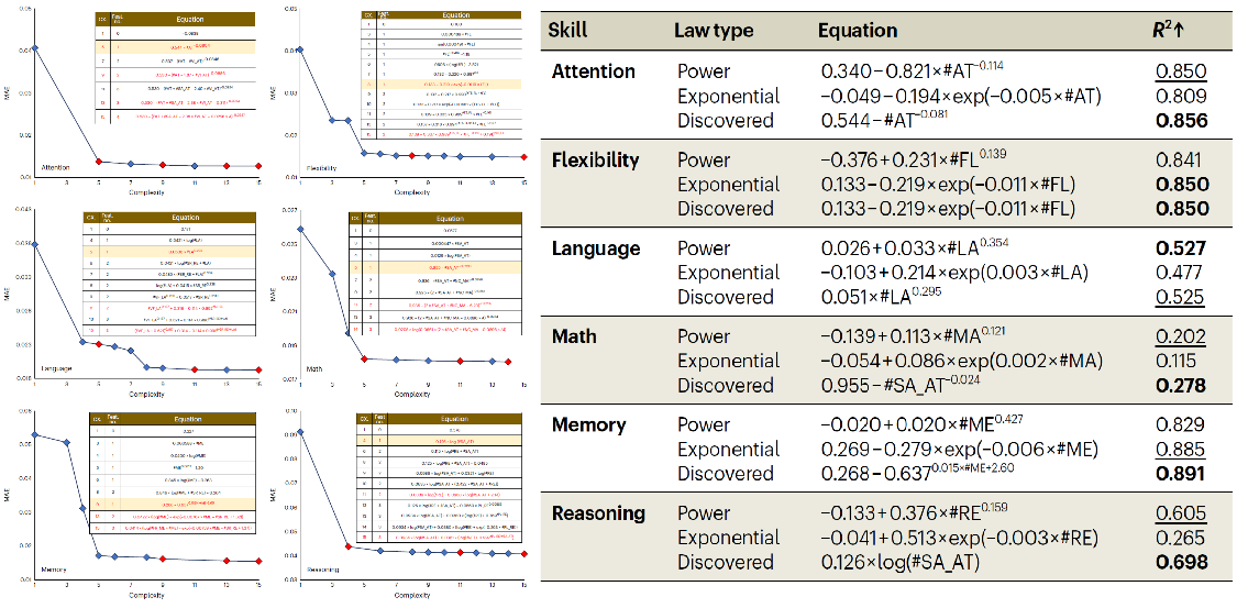 模擬實驗結(jié)果表明,該方法能夠在一定噪聲范圍內(nèi)準(zhǔn)確識別核心變量并重建預(yù)設(shè)的技能習(xí)得規(guī)律方程,驗證了所提方法的有效性。在大規(guī)模真實認(rèn)知技能訓(xùn)練數(shù)據(jù)的應(yīng)用中,通過該方法發(fā)現(xiàn)的技能習(xí)得規(guī)律在適應(yīng)度、擬合度等指標(biāo)上顯著優(yōu)于傳統(tǒng)和當(dāng)前主流學(xué)習(xí)模型。同時,通過該方法從數(shù)據(jù)中發(fā)現(xiàn)了兩類新的認(rèn)知技能習(xí)得規(guī)律(對數(shù)率與反冪率),并驗證了多項先前的研究發(fā)現(xiàn)。