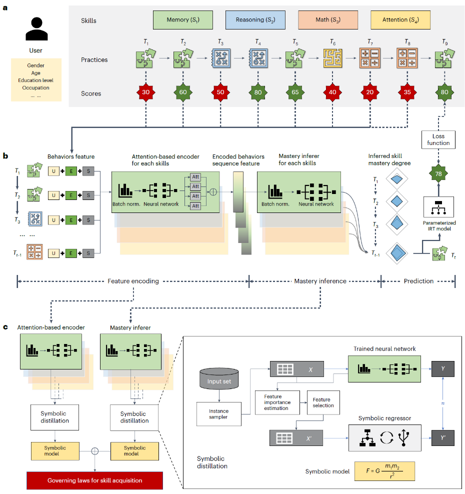 認(rèn)知技能習(xí)得是教育科學(xué)與認(rèn)知科學(xué)研究中一個重要的領(lǐng)域,掌握技能習(xí)得規(guī)律可以幫助人們更科學(xué)、更高效地學(xué)習(xí)知識和技能。然而,技能習(xí)得涉及多個復(fù)雜的認(rèn)知心理過程,傳統(tǒng)實驗范式揭示的規(guī)律往往存在爭議且缺乏普適性。該研究采用AI4Science范式,通過設(shè)計新穎的智能算法,自動從自然發(fā)生的大規(guī)模日志數(shù)據(jù)中挖掘內(nèi)蘊(yùn)的技能習(xí)得規(guī)律。文章針對學(xué)習(xí)狀態(tài)內(nèi)隱、算子搜索組合爆炸等問題,設(shè)計了一個兩階段的規(guī)律挖掘算法。首先,利用自回歸的方式訓(xùn)練深度學(xué)習(xí)模型,實現(xiàn)學(xué)習(xí)狀態(tài)計算與特征重要性評估。其次,提出一種符號化蒸餾的方法將神經(jīng)網(wǎng)絡(luò)模型解析為代數(shù)方程式,實現(xiàn)學(xué)習(xí)規(guī)律的顯式表達(dá)。