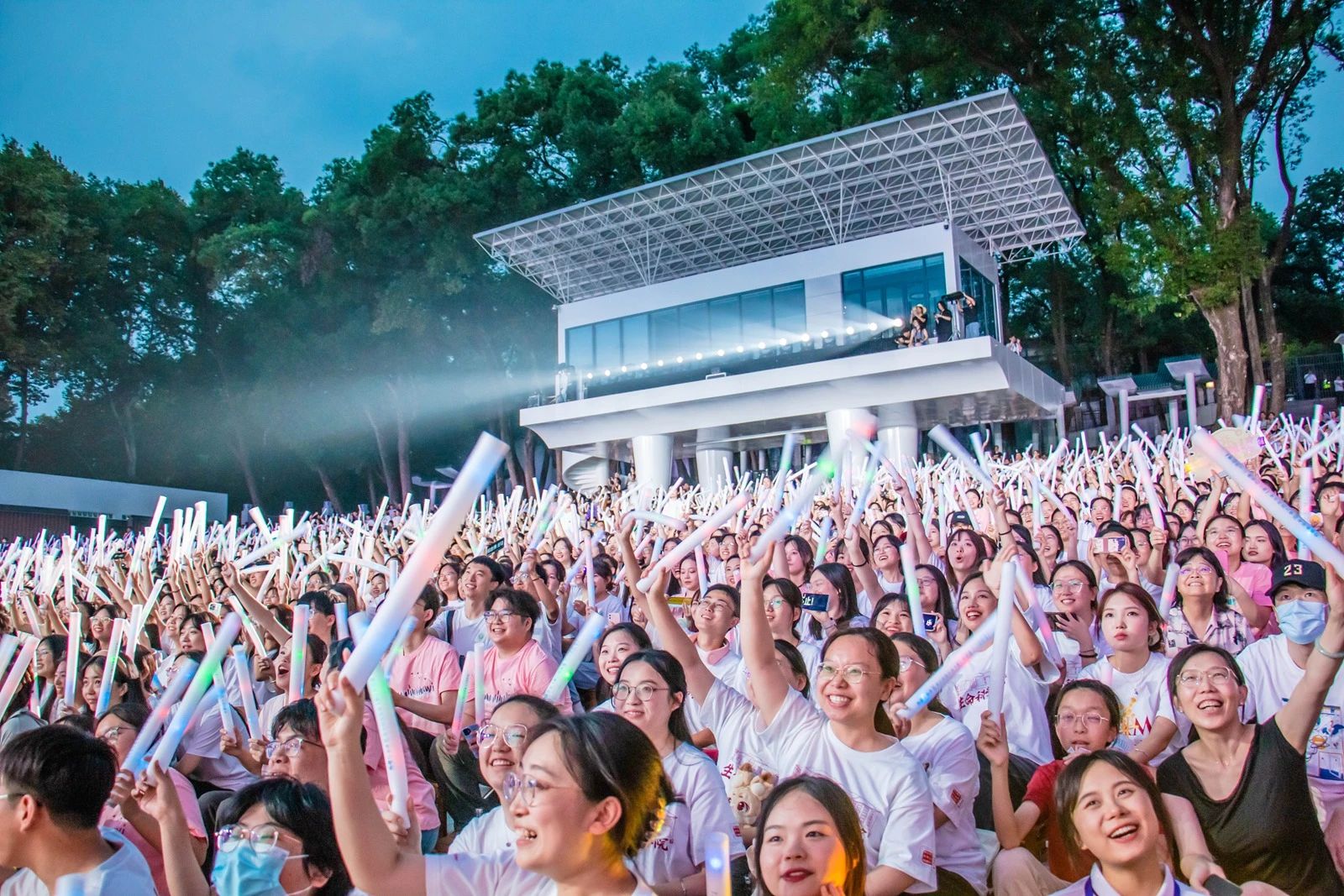 伴隨著《星河云端》舒緩悠揚的旋律,觀眾邂逅《向云端》的美好,頂著濛濛細雨,全場自發合唱畢業組歌。《追光者》與《入海》以溫婉的旋律陪伴畢業生們重溫了青澀的校園時光;由輔導員加入演唱的《再見》將全場情緒推向最高潮。