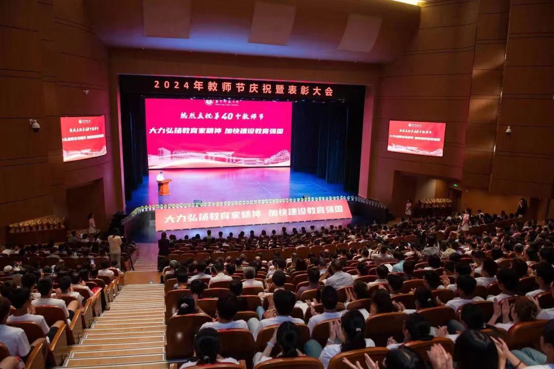 華大在線訊(記者 華軒)為慶祝第40個教師節,9月10日,學校2024年教師節慶祝暨表彰大會在大學生活動中心禮堂舉行。全體在校校領導,重要人才計劃、重要榮譽(獎項)獲得者,引進人才代表,榮休教師、從教30年、40年教師、新入職教師,校內各單位主要負責人,教職工黨支部書記以及學生代表等出席大會。大會由副校長任友洲主持。
