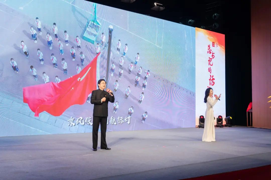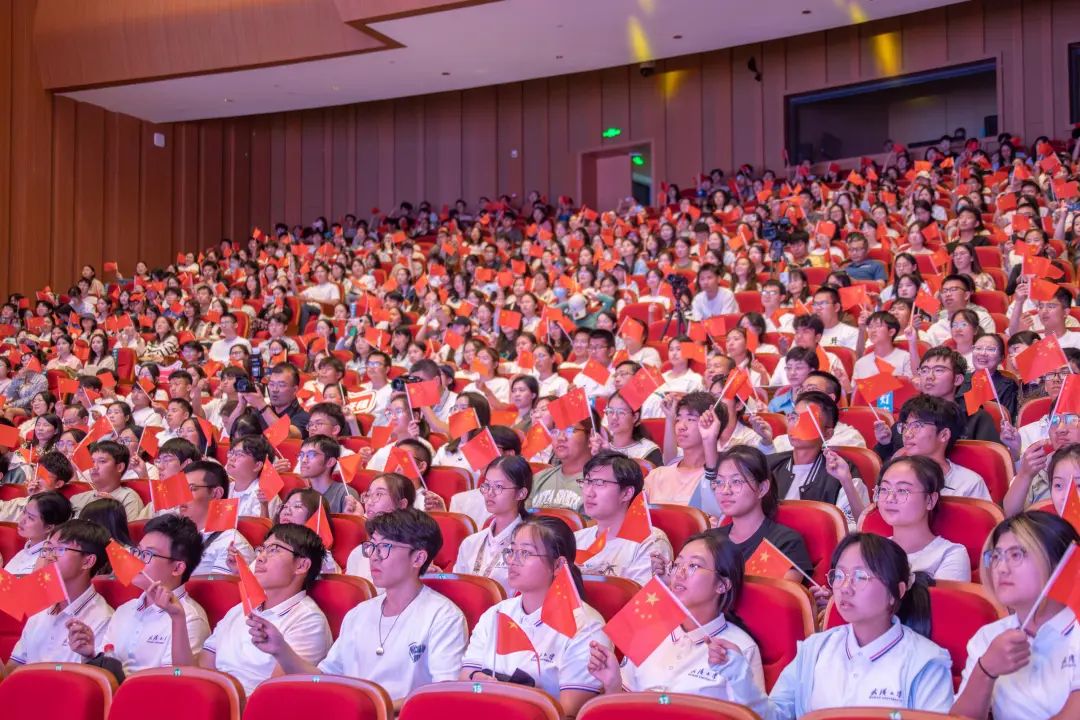 “五星紅旗你是我的驕傲,五星紅旗我為你自豪……”全體師生揮動手中的國旗,與華中師范大學大學生藝術團齊聲高唱《紅旗飄飄》,歌聲激昂,振奮人心。一曲《歌唱祖國》讓現場氛圍更加熱烈,師生們起立合唱,深深愛國情,油然而生。