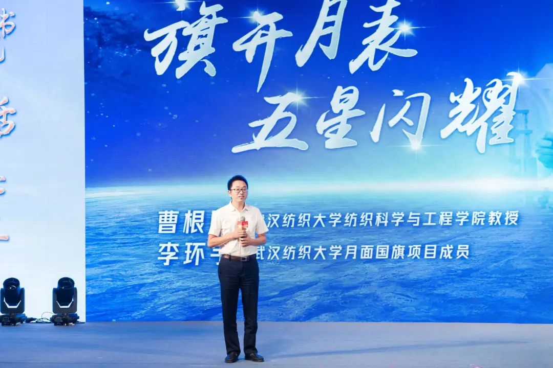 2024年6月,嫦娥六號著陸器攜帶的五星紅旗在月球背面成功展開,這面國旗背后是武漢紡織大學月面國旗項目團隊長達數年的創新之路。團隊成員李環宇同學為大家現場展示了這面由玄武巖制成的國旗樣品,自豪地說“這是我國首次在月球背面獨立動態展示的五星紅旗,是中國探測器在月球上打上的‘中國標識’!”武漢紡織大學曹根陽教授揭秘了月面國旗背后的故事。歷時十余年,無數次實驗,冥思苦想,攻堅克難,曹根陽依然覺得很值得,“紅旗登月,不僅是對我國載人登月宇航服材料的一次探索,更關乎我們中國人的尊嚴和榮譽。”“希望讓心中閃耀的五星紅旗,飄揚在每一個中國人足跡抵達的地方”的期許贏得陣陣掌聲。