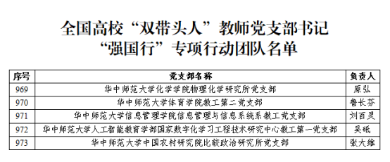 華大在線訊(通訊員 李杰)近日,教育部辦公廳公布了全國高校“雙帶頭人”教師黨支部書記“強國行”專項行動團隊(以下簡稱“強國行”專項行動)名單,我校5個黨支部入選。
