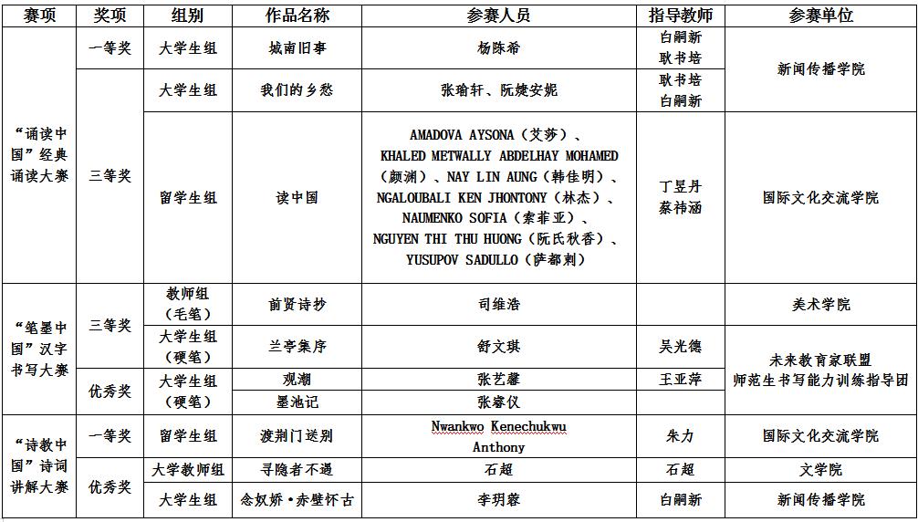 華大在線訊(通訊員 申定羽)近日,教育部、國(guó)家語(yǔ)委主辦的第六屆中華經(jīng)典誦寫(xiě)講大賽四大賽項(xiàng)已完成全部賽程,獲獎(jiǎng)名單公布。我校在全國(guó)決賽獲獎(jiǎng)10項(xiàng),其中,一等獎(jiǎng)2項(xiàng),三等獎(jiǎng)4項(xiàng),優(yōu)秀獎(jiǎng)4項(xiàng)。