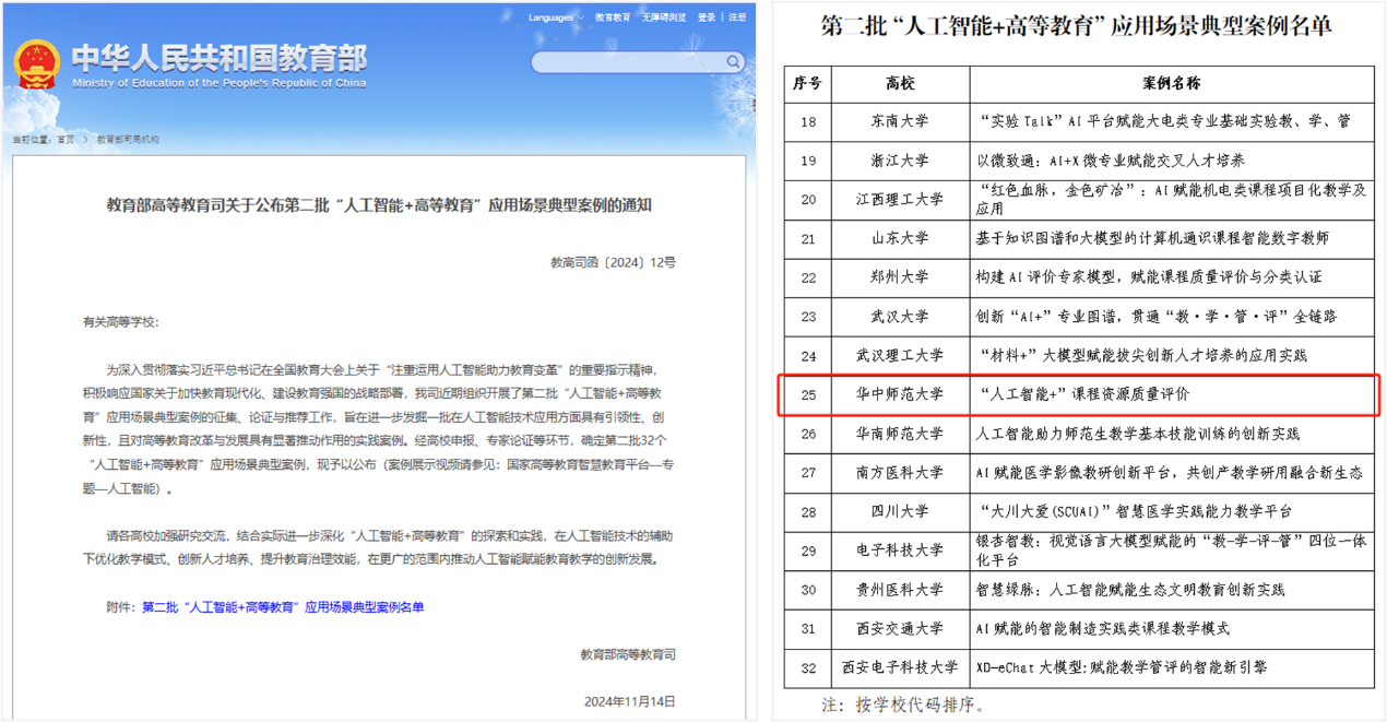 華大在線訊(通訊員 謝雨婷、陳敏)11月14日,教育部高教司公布了全國第二批32個“人工智能+高等教育”應用場景典型案例,我校“‘人工智能+’課程資源質量評價”成功入選。
