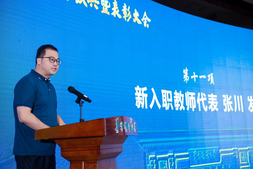 新入職教師代表、體育學(xué)院張川老師表達(dá)了對(duì)學(xué)校關(guān)懷的感謝及成為我校教師的自豪之情,并表示將會(huì)抓住重要機(jī)遇、努力提高本領(lǐng)、涵養(yǎng)家國(guó)情懷,秉承“求實(shí)創(chuàng)新 立德樹人”的華師校訓(xùn)和“忠誠(chéng)博雅 樸實(shí)剛毅”的華師精神,努力完成傳道授業(yè)解惑的本職工作,爭(zhēng)做學(xué)生為學(xué)、為事、為人的“好老師”,成為塑造學(xué)生品格、品行、品味的“大先生”,為學(xué)校各項(xiàng)事業(yè)再上高峰貢獻(xiàn)智慧與力量。