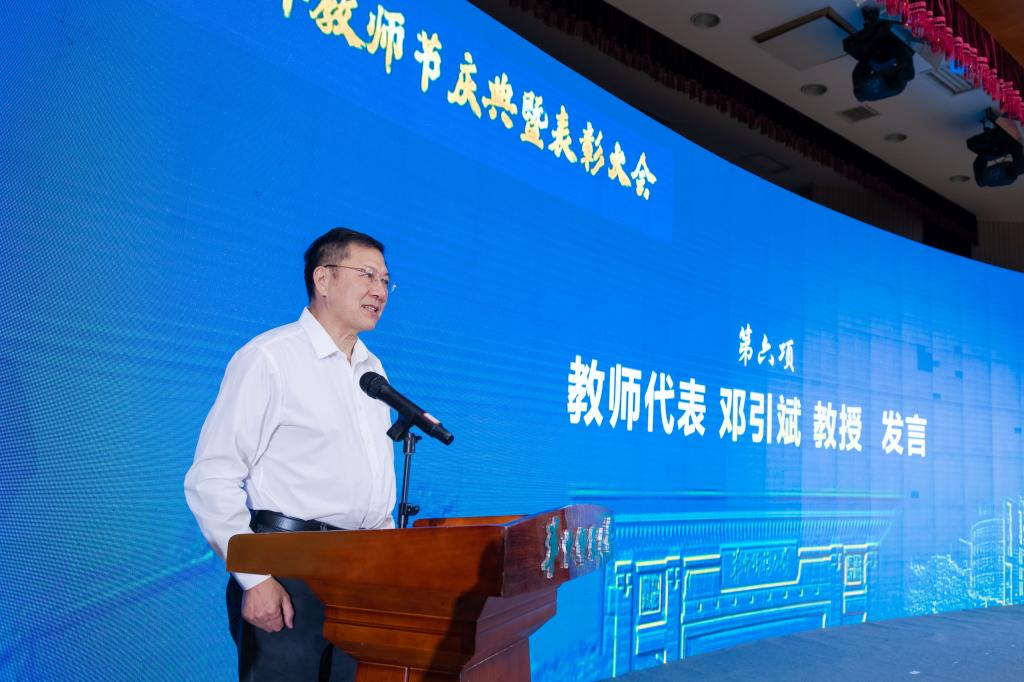 教職工代表、博雅學(xué)者、數(shù)統(tǒng)學(xué)院鄧引斌教授回顧了自己在桂子山求學(xué)從教的人生經(jīng)歷,并表達(dá)了對(duì)學(xué)校與國(guó)家的感激之情。站在新的歷史起點(diǎn)上,百廿華大堅(jiān)定信心、昂首邁步,翻篇?dú)w零再出發(fā),乘勢(shì)而上再?zèng)_鋒。今后將繼續(xù)發(fā)揚(yáng)科學(xué)家精神,勇闖自主創(chuàng)新無(wú)人區(qū),敢啃關(guān)鍵技術(shù)硬骨頭,為早日建成教師教育領(lǐng)先的世界一流大學(xué)而努力奮斗,做一名無(wú)愧于華師、無(wú)愧于時(shí)代的人民教師!