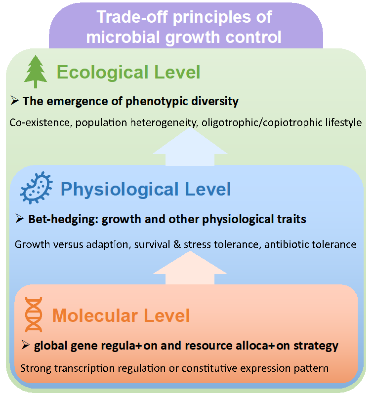 圖1:通過生長調控的權衡理論體系將微生物學的三個研究層次進行了有機統一